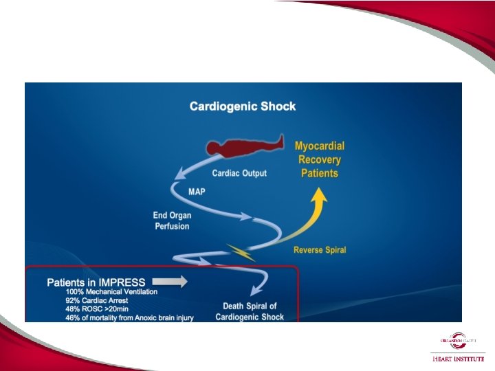 POPULATION STUDIES SHOW REDUCED MORTALITY WITH PVAD IN AMI CARDIOGENIC SHOCK Mortality AMI Cardiogenic Shock Pre/Post PVAD Era 52% Mortality In AMI Cardiogenic Shock ECMO/e. LVAD vs. PVAD 56% p=0. 012 p<0. 001 43% 42% N=1188 Co-morbidity Matching N=11, 887 2004 - 2007 2008 - 2011 No PVAD Era Stretch, et. al JACC 2014 National Inpatient Sample Maini, et. al. CCI, 2014 and SCAI/ACC/STS /HFSA Expert Consensus Document Surgical MCS PVAD 18