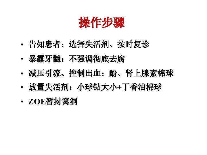 Procedure • C/S of the root canal system • A dry cotton pellet placed in the pulp chamber • Complete caries removal and effective temporary coronal seal to prevent contamination • Occlusal reduction 咬合调整