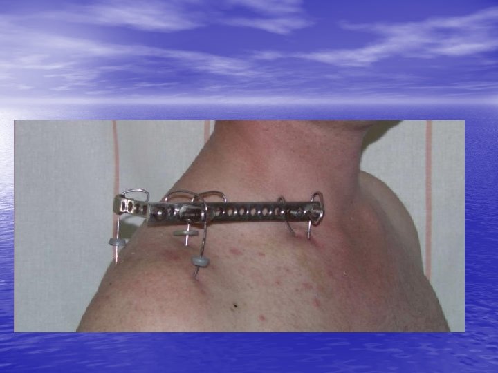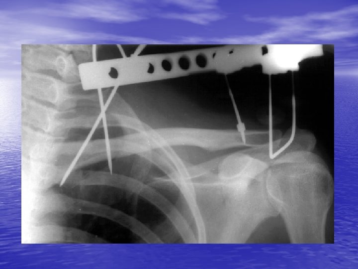 Duration of fixation • 4 weeks for acute cases (fixation within 05 days after the injury), • 6 -8 weeks for delayed admission (6 -14 days) • In cases of dislocations older 2 weeks => AC and CC ligaments repair by tendon allografts • Stability test before hardware removal