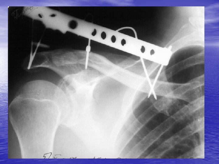 Results • Self-care, light housework – 3 -5 days • Deep infection 0/24 – 10 patients (42%) sustained skin irritation and serum drainage from acromial wire site only • 23/24 healed – 1/24: missed acromial wire cut-out => symptomatic instability => AC+CC repair (allo tendons) => uneventful healing • 1 year follow up - 15 patients. – All restored their pre-injury status – Occasional pain in hyperabduction – 3/15