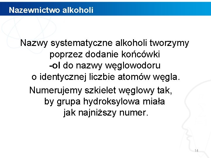 Nazewnictwo alkoholi Nazwy systematyczne alkoholi tworzymy poprzez dodanie końcówki -ol do nazwy węglowodoru o identycznej liczbie atomów węgla. Numerujemy szkielet węglowy tak, by grupa hydroksylowa miała jak najniższy numer. 14