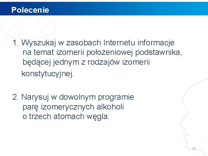 Polecenie 1. Wyszukaj w zasobach Internetu informacje na temat izomerii położeniowej podstawnika, będącej jednym z rodzajów izomerii konstytucyjnej. 2. Narysuj w dowolnym programie parę izomerycznych alkoholi o trzech atomach węgla. 19