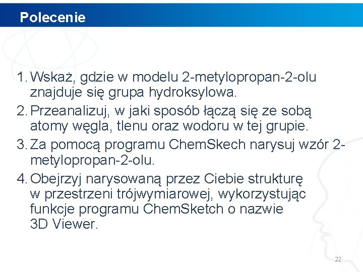 Polecenie 1. Wskaż, gdzie w modelu 2 -metylopropan-2 -olu znajduje się grupa hydroksylowa. 2. Przeanalizuj, w jaki sposób łączą się ze sobą atomy węgla, tlenu oraz wodoru w tej grupie. 3. Za pomocą programu Chem. Skech narysuj wzór 2 metylopropan-2 -olu. 4. Obejrzyj narysowaną przez Ciebie strukturę w przestrzeni trójwymiarowej, wykorzystując funkcje programu Chem. Sketch o nazwie 3 D Viewer. 22