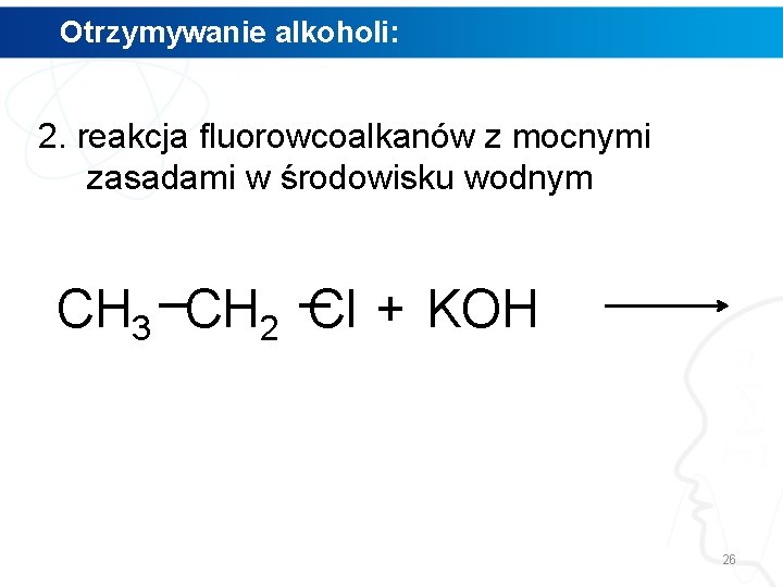 Otrzymywanie alkoholi: 2. reakcja fluorowcoalkanów z mocnymi zasadami w środowisku wodnym CH 3 CH 2 Cl + KOH 26