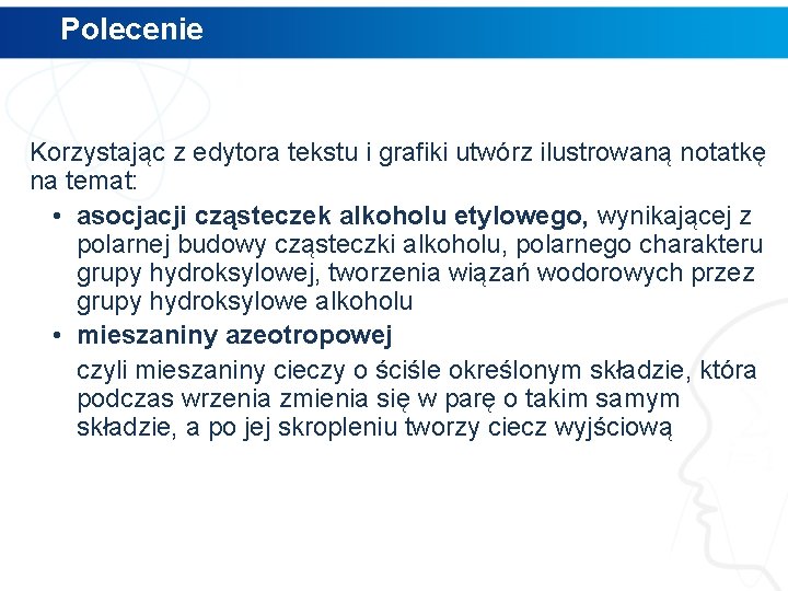 Polecenie Korzystając z edytora tekstu i grafiki utwórz ilustrowaną notatkę na temat: • asocjacji cząsteczek alkoholu etylowego, wynikającej z polarnej budowy cząsteczki alkoholu, polarnego charakteru grupy hydroksylowej, tworzenia wiązań wodorowych przez grupy hydroksylowe alkoholu • mieszaniny azeotropowej czyli mieszaniny cieczy o ściśle określonym składzie, która podczas wrzenia zmienia się w parę o takim samym składzie, a po jej skropleniu tworzy ciecz wyjściową
