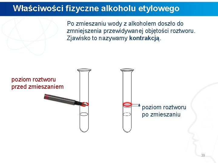 Właściwości fizyczne alkoholu etylowego Po zmieszaniu wody z alkoholem doszło do zmniejszenia przewidywanej objętości roztworu. Zjawisko to nazywamy kontrakcją. poziom roztworu przed zmieszaniem poziom roztworu po zmieszaniu 39
