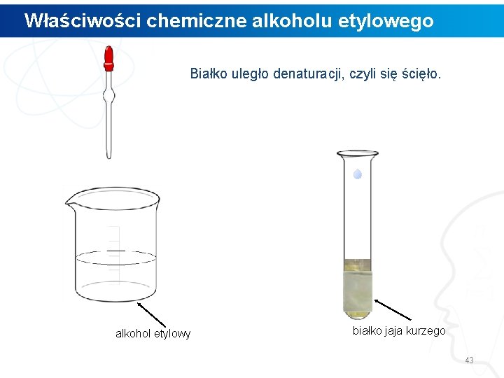 Właściwości chemiczne alkoholu etylowego Białko uległo denaturacji, czyli się ścięło. alkohol etylowy białko jaja kurzego 43
