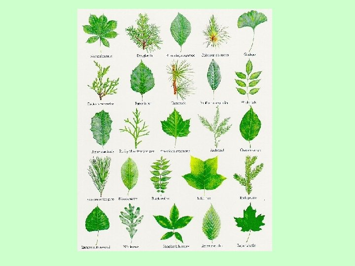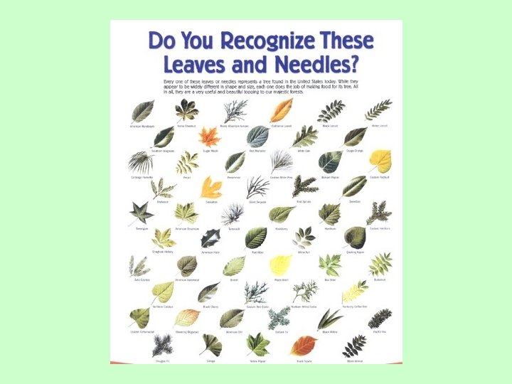 Leaf characteristics-deciduous • Leaf arrangement: whorl, alternate, opposite • Leaf type: simple or compound • Leaf edge: entire (smooth), lobed (projection), toothed (serrated) • Leaf texture: hairy, waxy, rough, smooth, thick, thin, etc. • Leaf shape: various