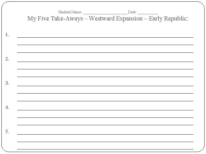 Student Name: ______________ Date: __________ Westward Expansion – Early Republic – Tree Map – SPRITE Dates of Era: SOCIAL POLITICA RELIGIOUS INTERNATIONA L L TECHNOLOGIC AL ECONOMI C