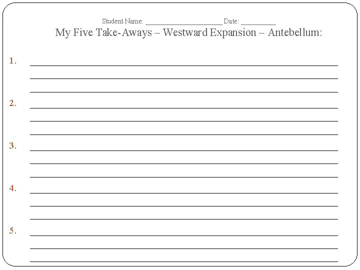 Student Name: ______________ Date: __________ Westward Expansion – Antebellum – Tree Map – SPRITE Dates of Era: SOCIAL POLITICA RELIGIOUS INTERNATIONA L L TECHNOLOGIC AL ECONOMI C