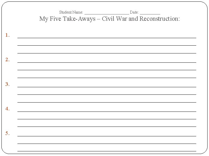 Student Name: ______________ Date: __________ Civil War and Reconstruction – Tree Map – Terms Dates of Era: Important Dates Important People Important Events/ Battles Important Documents/ Court Cases Important Academic Vocabulary