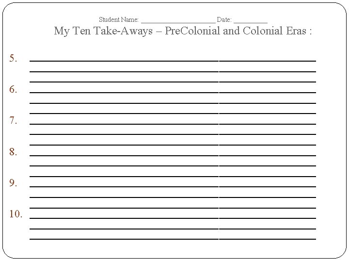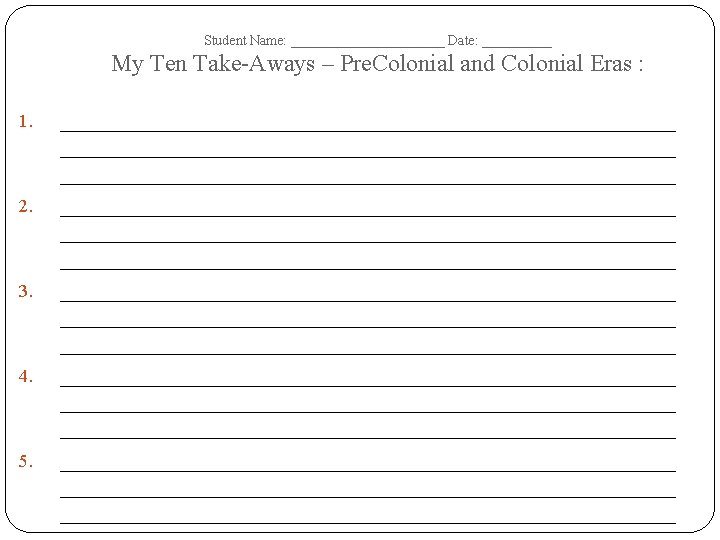 Student Name: ______________ Date: __________ The Pre. Colonial and Colonial Eras – Tree Map – Terms Dates of Era: Important Dates Important People Important Events/ Battles Important Documents/ Court Cases Important Academic Vocabulary