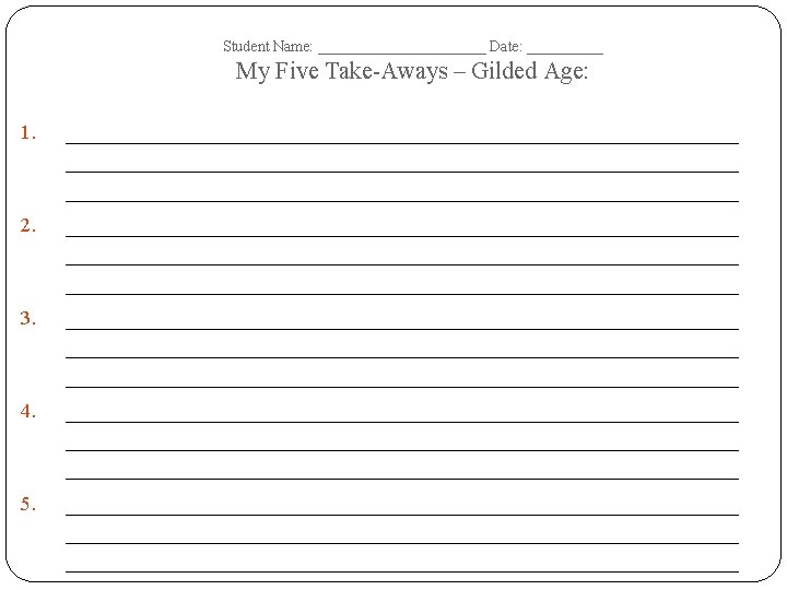 Student Name: ______________ Date: __________ Gilded Age– Tree Map – Terms Dates of Era: Important Dates Important People Important Events/ Battles Important Documents/ Court Cases Important Academic Vocabulary