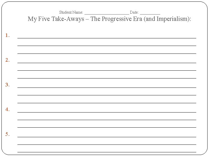 Student Name: ______________ Date: __________ The Progressive Era (and Imperialism) – Tree Map – Terms Dates of Era: Important Dates Important People Important Events/ Battles Important Documents/ Court Cases Important Academic Vocabulary