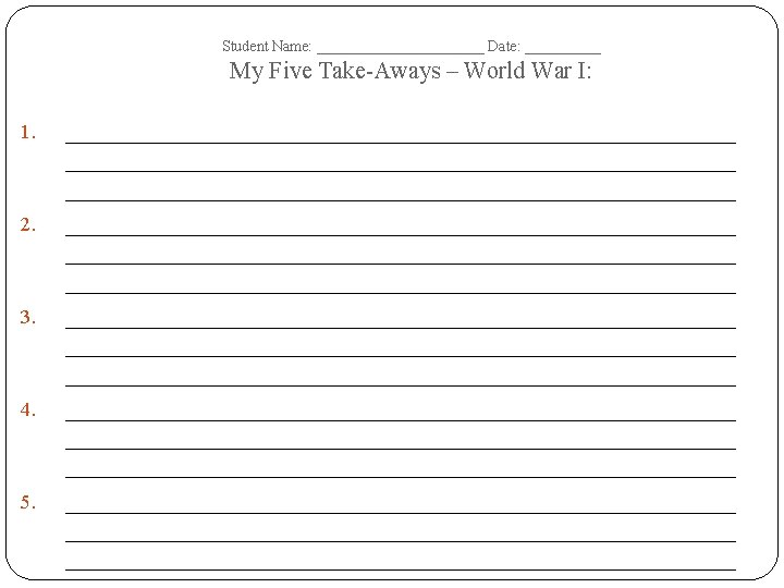 Student Name: ______________ Date: __________ World War I – Tree Map – Terms Dates of Era: Important Dates Important People Important Events/ Battles Important Documents/ Court Cases Important Academic Vocabulary