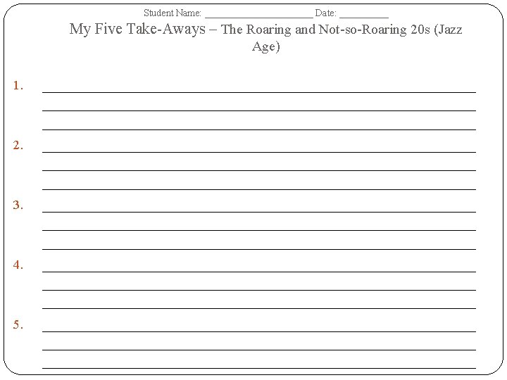 Student Name: ______________ Date: __________ The Roaring and Not-so-Roaring 20 s (Jazz Age) – Tree Map – Terms Dates of Era: Important Dates Important People Important Events/ Battles Important Documents/ Court Cases Important Academic Vocabulary