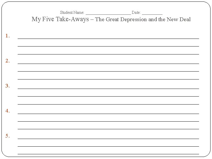 Student Name: ______________ Date: __________ The Great Depression and the New Deal – Tree Map – Terms Dates of Era: Important Dates Important People Important Events/ Battles Important Documents/ Court Cases Important Academic Vocabulary