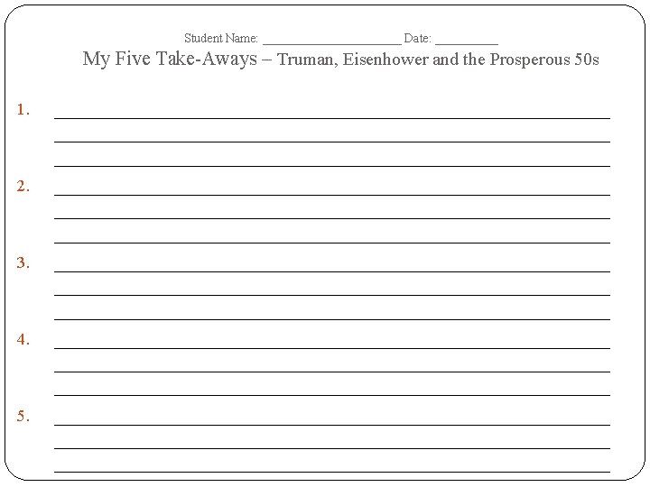 Student Name: ______________ Date: __________ Truman, Eisenhower and the Prosperous 50 s – Tree Map – Terms Dates of Era: Important Dates Important People Important Events/ Battles Important Documents/ Court Cases Important Academic Vocabulary