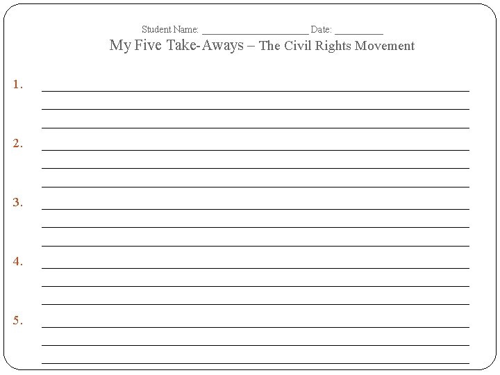 Student Name: ______________ Date: __________ The Civil Rights Movement – Tree Map – Terms Dates of Era: Important Dates Important People Important Events/ Battles Important Documents/ Court Cases Important Academic Vocabulary
