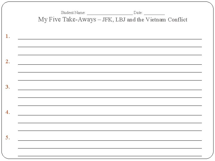 Student Name: ______________ Date: __________ JFK, LBJ and the Vietnam Conflict – Tree Map – Terms Dates of Era: Important Dates Important People Important Events/ Battles Important Documents/ Court Cases Important Academic Vocabulary