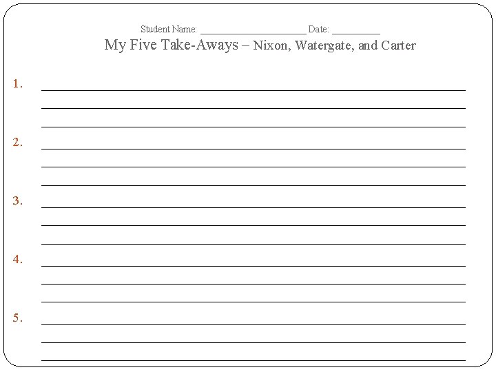 Student Name: ______________ Date: __________ Nixon, Watergate, and Carter – Tree Map – Terms Dates of Era: Important Dates Important People Important Events/ Battles Important Documents/ Court Cases Important Academic Vocabulary