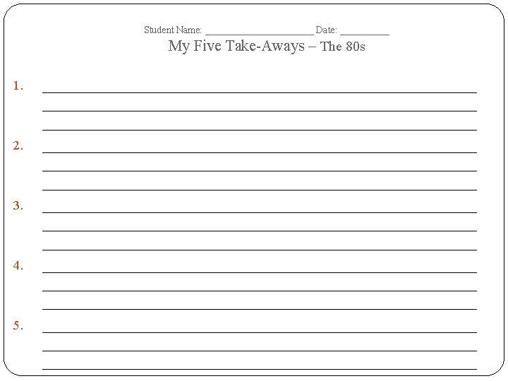 Student Name: ______________ Date: __________ The 80 s – Tree Map – Terms Dates of Era: Important Dates Important People Important Events/ Battles Important Documents/ Court Cases Important Academic Vocabulary