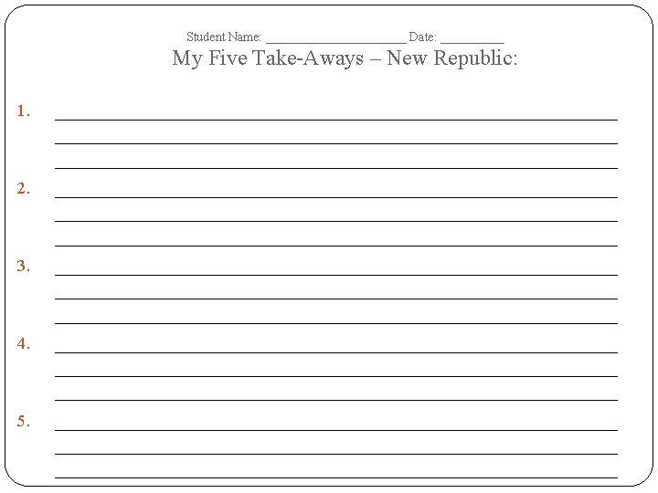 Student Name: ______________ Date: __________ New Republic– Tree Map – Terms Dates of Era: Important Dates Important People Important Events/ Battles Important Documents/ Court Cases Important Academic Vocabulary