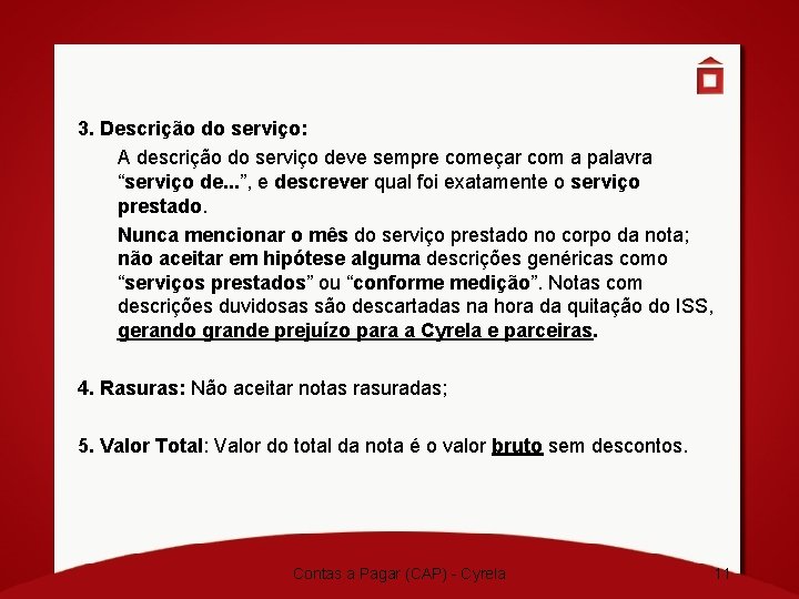 3. Descrição do serviço: A descrição do serviço deve sempre começar com a palavra “serviço de. . . ”, e descrever qual foi exatamente o serviço prestado. Nunca mencionar o mês do serviço prestado no corpo da nota; não aceitar em hipótese alguma descrições genéricas como “serviços prestados” ou “conforme medição”. Notas com descrições duvidosas são descartadas na hora da quitação do ISS, gerando grande prejuízo para a Cyrela e parceiras. 4. Rasuras: Não aceitar notas rasuradas; 5. Valor Total: Valor do total da nota é o valor bruto sem descontos. Contas a Pagar (CAP) - Cyrela 11