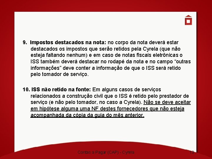 9. Impostos destacados na nota: no corpo da nota deverá estar destacados os impostos que serão retidos pela Cyrela (que não esteja faltando nenhum) e em caso de notas fiscais eletrônicas o ISS também deverá destacar no rodapé da nota e no campo “outras informações” deve conter a informação de que o ISS será retido pelo tomador de serviço. 10. ISS não retido na fonte: Em alguns casos de serviços relacionados a construção civil que o ISS é retido pelo prestador de serviço (e não pelo tomador, no caso a Cyrela). Não se deve aceitar em hipótese alguma NF destes fornecedores que não esteja acompanhada da cópia da guia do mês anterior. Contas a Pagar (CAP) - Cyrela 13