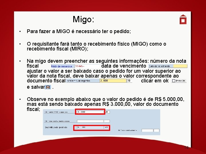 Migo: • Para fazer a MIGO é necessário ter o pedido; • O requisitante fará tanto o recebimento físico (MIGO) como o recebimento fiscal (MIRO); • Na migo devem preencher as seguintes informações: número da nota fiscal data de vencimento ajustar o valor a ser baixado caso o pedido for um valor superior ao valor da nota fiscal, deve baixar apenas o valor correspondente ao documento fiscal clicar em ok e salvar . • Observe no exemplo abaixo que o valor do pedido é de R$ 5. 000, mas está sendo baixado apenas R$ 3. 000, valor do documento fiscal; 14