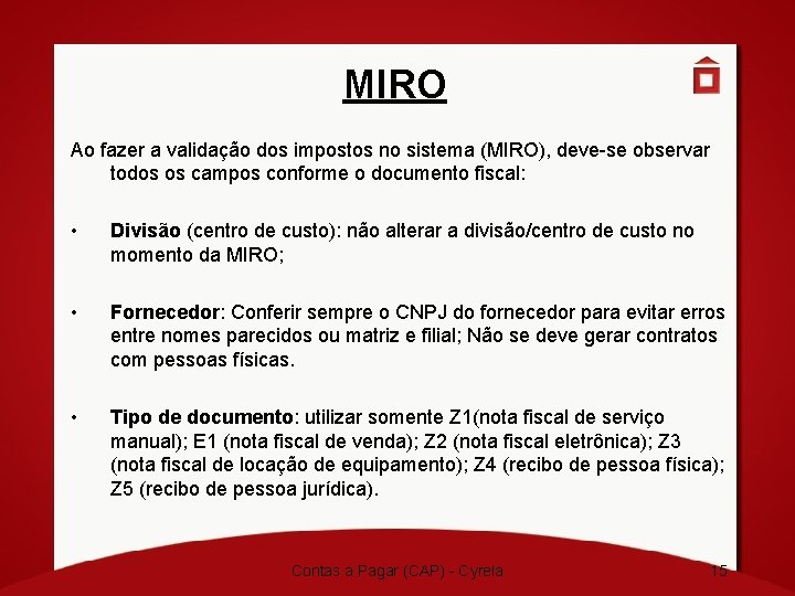 MIRO Ao fazer a validação dos impostos no sistema (MIRO), deve-se observar todos os campos conforme o documento fiscal: • Divisão (centro de custo): não alterar a divisão/centro de custo no momento da MIRO; • Fornecedor: Conferir sempre o CNPJ do fornecedor para evitar erros entre nomes parecidos ou matriz e filial; Não se deve gerar contratos com pessoas físicas. • Tipo de documento: utilizar somente Z 1(nota fiscal de serviço manual); E 1 (nota fiscal de venda); Z 2 (nota fiscal eletrônica); Z 3 (nota fiscal de locação de equipamento); Z 4 (recibo de pessoa física); Z 5 (recibo de pessoa jurídica). Contas a Pagar (CAP) - Cyrela 15