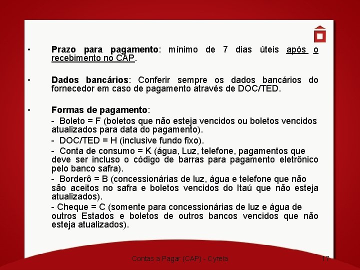 • Prazo para pagamento: mínimo de 7 dias úteis após o recebimento no CAP. • Dados bancários: Conferir sempre os dados bancários do fornecedor em caso de pagamento através de DOC/TED. • Formas de pagamento: - Boleto = F (boletos que não esteja vencidos ou boletos vencidos atualizados para data do pagamento). - DOC/TED = H (inclusive fundo fixo). - Conta de consumo = K (água, Luz, telefone, pagamentos que deve ser incluso o código de barras para pagamento eletrônico pelo banco safra). - Borderô = B (concessionárias de luz, água e telefone que não são aceitos no safra e boletos vencidos do Itaú que não esteja atualizados). - Cheque = C (somente para concessionárias de luz e água de outros Estados e boletos de outros bancos vencidos que não esteja atualizados). Contas a Pagar (CAP) - Cyrela 17
