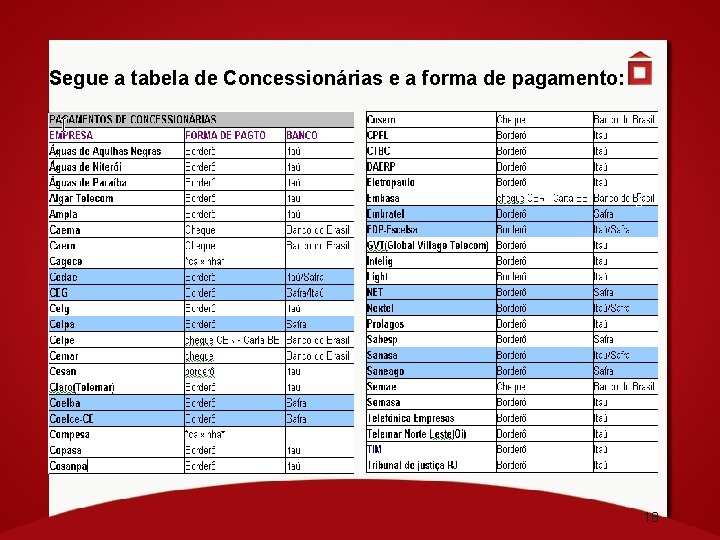 Segue a tabela de Concessionárias e a forma de pagamento: 18