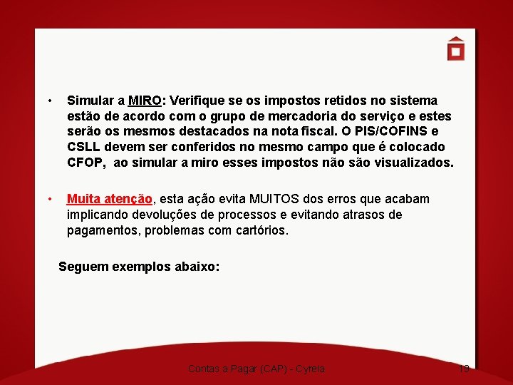 • Simular a MIRO: Verifique se os impostos retidos no sistema estão de acordo com o grupo de mercadoria do serviço e estes serão os mesmos destacados na nota fiscal. O PIS/COFINS e CSLL devem ser conferidos no mesmo campo que é colocado CFOP, ao simular a miro esses impostos não são visualizados. • Muita atenção, esta ação evita MUITOS dos erros que acabam implicando devoluções de processos e evitando atrasos de pagamentos, problemas com cartórios. Seguem exemplos abaixo: Contas a Pagar (CAP) - Cyrela 19