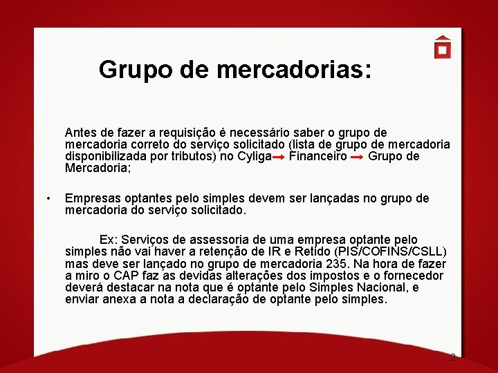 Grupo de mercadorias: Antes de fazer a requisição é necessário saber o grupo de mercadoria correto do serviço solicitado (lista de grupo de mercadoria disponibilizada por tributos) no Cyliga Financeiro Grupo de Mercadoria; • Empresas optantes pelo simples devem ser lançadas no grupo de mercadoria do serviço solicitado. Ex: Serviços de assessoria de uma empresa optante pelo simples não vai haver a retenção de IR e Retido (PIS/COFINS/CSLL) mas deve ser lançado no grupo de mercadoria 235. Na hora de fazer a miro o CAP faz as devidas alterações dos impostos e o fornecedor deverá destacar na nota que é optante pelo Simples Nacional, e enviar anexa a nota a declaração de optante pelo simples. 2
