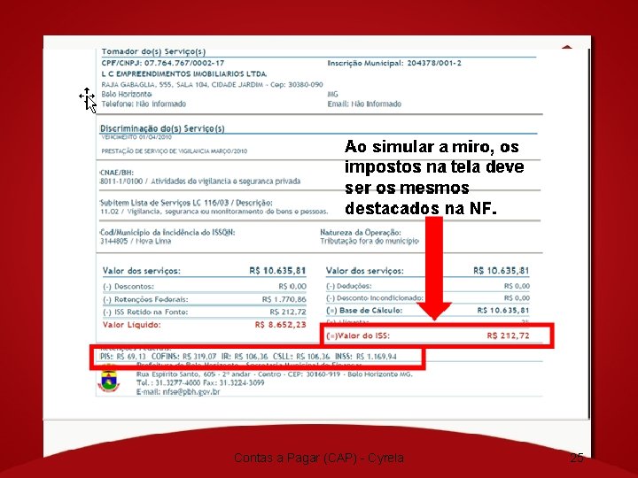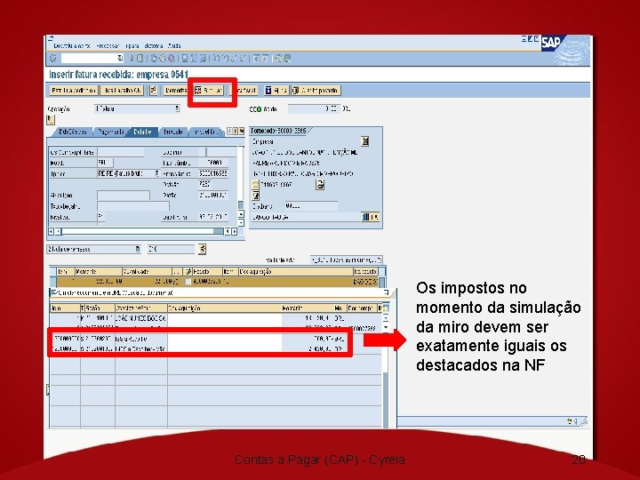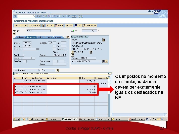 Os impostos no momento da simulação da miro devem ser exatamente iguais os destacados na NF Contas a Pagar (CAP) - Cyrela 22
