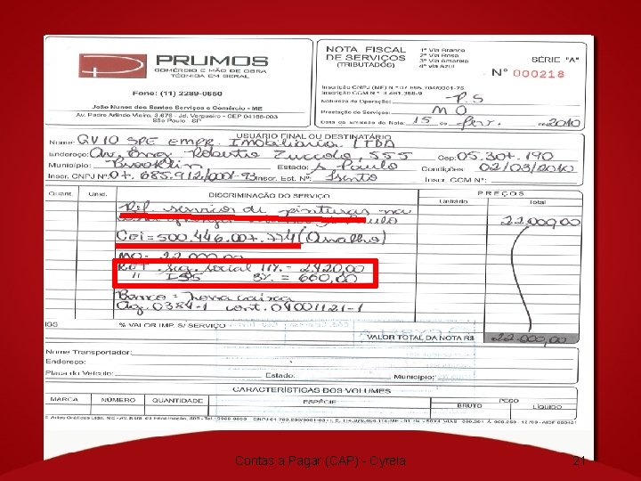 Ao receber a nota fiscal antes de prosseguir com o lançamento no SAP as seguintes no documento fiscal devem ser observados: 1. Data da nota: Não receber NF de serviços emitidas após o dia 20 devido ao vencimento dos impostos (ISS e INSS); 2. Dados para faturamento: Conferir razão social da SPE, CNPJ, e em caso de obra conferir também o endereço da obra, CEI da obra, descrição do serviço (de acordo com o contrato), tributos destacados (devem estar de acordo com o contrato) Notas fiscais com dados faltantes ou incorretos devem ser devolvidas/informadas ao fornecedor, para que sejam canceladas e reemitidas. Contas a Pagar (CAP) - Cyrela 10