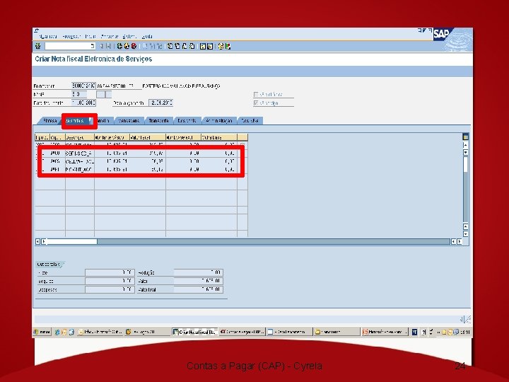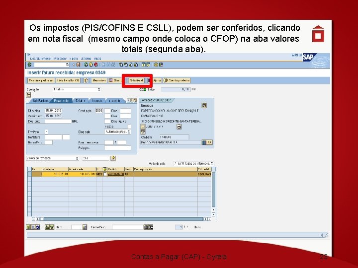Os impostos (PIS/COFINS E CSLL), podem ser conferidos, clicando em nota fiscal (mesmo campo onde coloca o CFOP) na aba valores totais (segunda aba). Contas a Pagar (CAP) - Cyrela 23