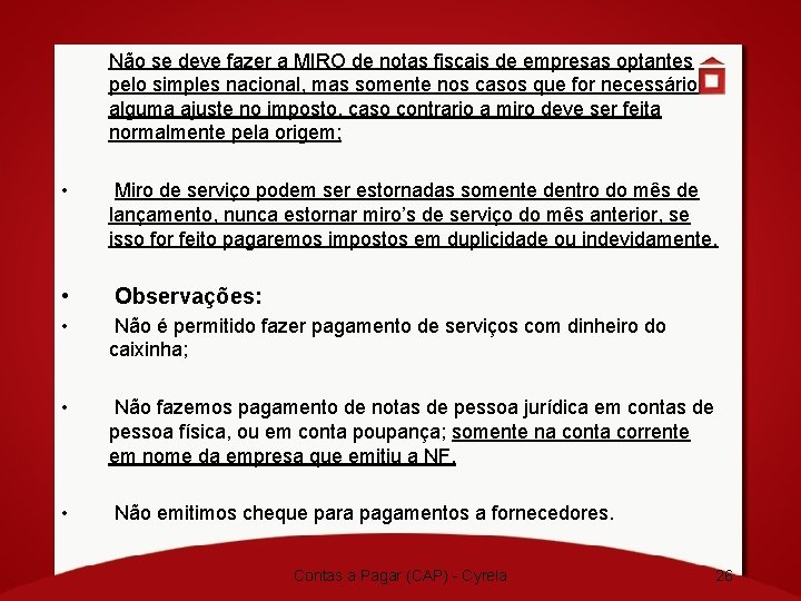 • Nunca aceite NF sem CEI; • Muita atenção na descrição do serviço na NF; • Não aceite NF sem apresentação da GFIP do mês anterior; • É de suma importância não contratar serviços de pessoas físicas não cadastradas nos órgãos públicos. Além de onerar em 20% o valor do serviço prestado , coloca a empresa sob risco de caracterizar vínculo empregatício. • Simular sempre a miro antes de salvar e verificar se os impostos foram retidos de acordo com o grupo de mercadoria do serviço, que devem iguais aos destacados na nota fiscal. • Miro de serviço podem ser estornadas somente dentro do mês de lançamento, nunca estornar miro’s de serviço do mês anterior, se isso for feito pagaremos impostos em duplicidade ou indevidamente. Contas a Pagar (CAP) - Cyrela 42