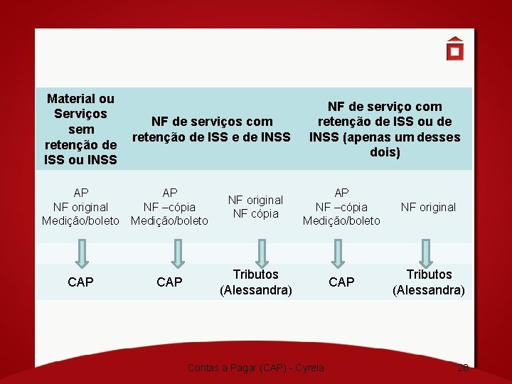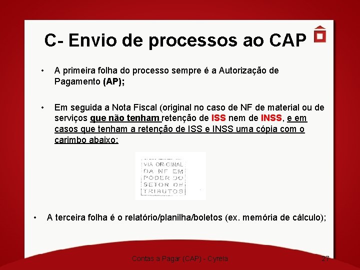 C- Envio de processos ao CAP • • A primeira folha do processo sempre é a Autorização de Pagamento (AP); • Em seguida a Nota Fiscal (original no caso de NF de material ou de serviços que não tenham retenção de ISS nem de INSS, e em casos que tenham a retenção de ISS e INSS uma cópia com o carimbo abaixo: A terceira folha é o relatório/planilha/boletos (ex. memória de cálculo); Contas a Pagar (CAP) - Cyrela 27