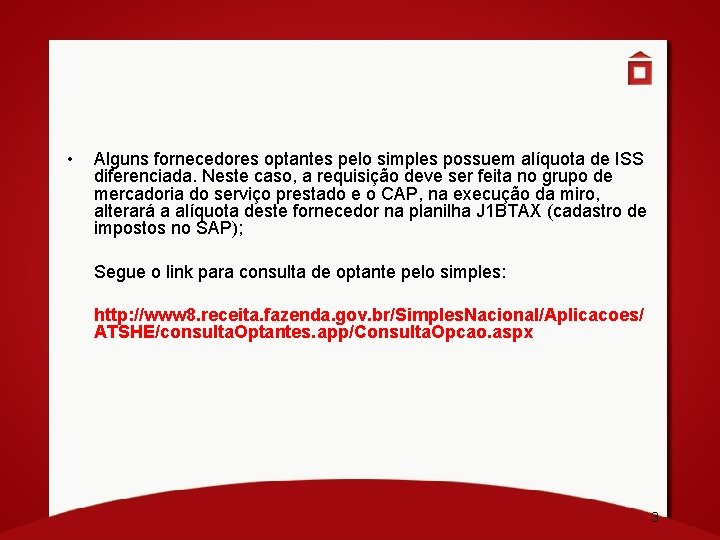 • Alguns fornecedores optantes pelo simples possuem alíquota de ISS diferenciada. Neste caso, a requisição deve ser feita no grupo de mercadoria do serviço prestado e o CAP, na execução da miro, alterará a alíquota deste fornecedor na planilha J 1 BTAX (cadastro de impostos no SAP); Segue o link para consulta de optante pelo simples: http: //www 8. receita. fazenda. gov. br/Simples. Nacional/Aplicacoes/ ATSHE/consulta. Optantes. app/Consulta. Opcao. aspx 3