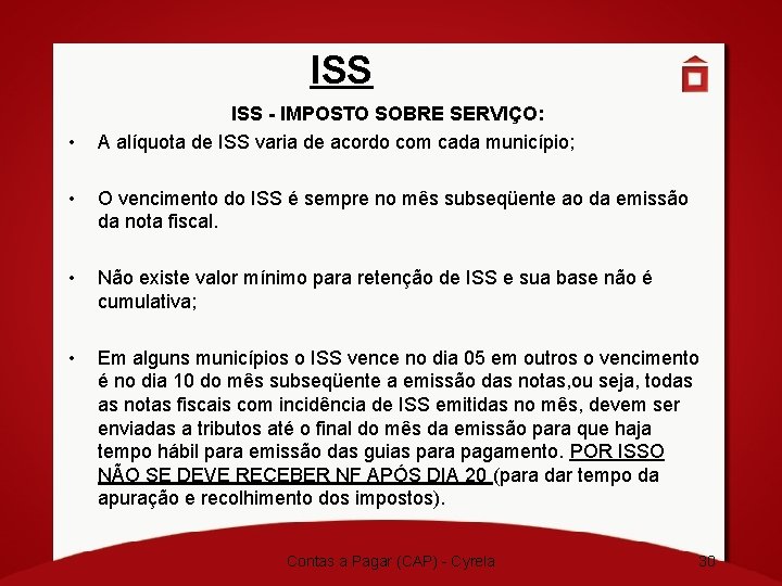 ISS • ISS - IMPOSTO SOBRE SERVIÇO: A alíquota de ISS varia de acordo com cada município; • O vencimento do ISS é sempre no mês subseqüente ao da emissão da nota fiscal. • Não existe valor mínimo para retenção de ISS e sua base não é cumulativa; • Em alguns municípios o ISS vence no dia 05 em outros o vencimento é no dia 10 do mês subseqüente a emissão das notas, ou seja, todas as notas fiscais com incidência de ISS emitidas no mês, devem ser enviadas a tributos até o final do mês da emissão para que haja tempo hábil para emissão das guias para pagamento. POR ISSO NÃO SE DEVE RECEBER NF APÓS DIA 20 (para dar tempo da apuração e recolhimento dos impostos). Contas a Pagar (CAP) - Cyrela 30
