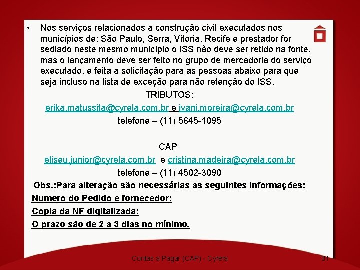 • Nos serviços relacionados a construção civil executados nos municípios de: São Paulo, Serra, Vitoria, Recife e prestador for sediado neste mesmo município o ISS não deve ser retido na fonte, mas o lançamento deve ser feito no grupo de mercadoria do serviço executado, e feita a solicitação para as pessoas abaixo para que seja incluso na lista de exceção para não retenção do ISS. TRIBUTOS: erika. matussita@cyrela. com. br e ivani. moreira@cyrela. com. br telefone – (11) 5645 -1095 CAP eliseu. junior@cyrela. com. br e cristina. madeira@cyrela. com. br telefone – (11) 4502 -3090 Obs. : Para alteração são necessárias as seguintes informações: Numero do Pedido e fornecedor; Copia da NF digitalizada; O prazo são de 2 a 3 dias no mínimo. Contas a Pagar (CAP) - Cyrela 31