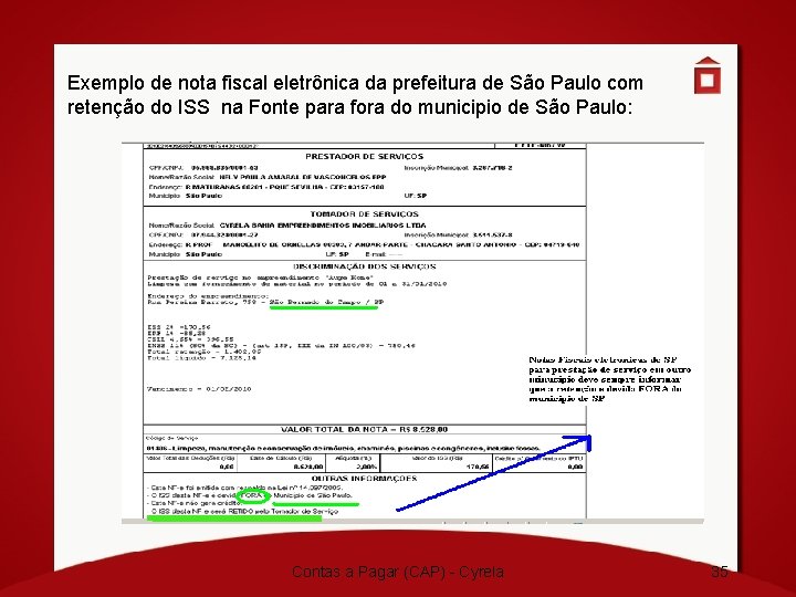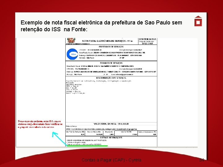Exemplo de nota fiscal eletrônica da prefeitura de São Paulo com retenção do ISS na Fonte: Contas a Pagar (CAP) - Cyrela 33