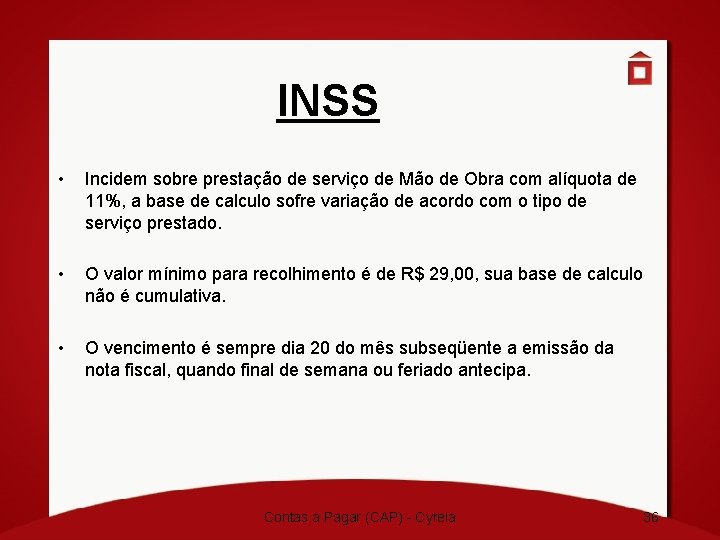 INSS • Incidem sobre prestação de serviço de Mão de Obra com alíquota de 11%, a base de calculo sofre variação de acordo com o tipo de serviço prestado. • O valor mínimo para recolhimento é de R$ 29, 00, sua base de calculo não é cumulativa. • O vencimento é sempre dia 20 do mês subseqüente a emissão da nota fiscal, quando final de semana ou feriado antecipa. Contas a Pagar (CAP) - Cyrela 36