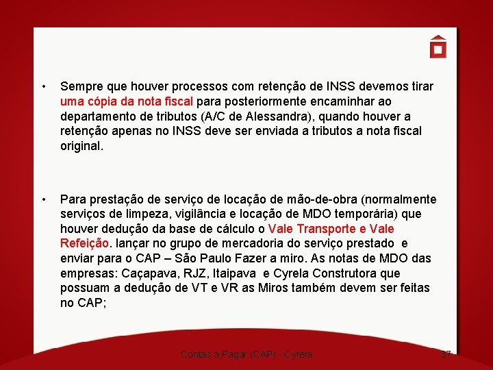 • Sempre que houver processos com retenção de INSS devemos tirar uma cópia da nota fiscal para posteriormente encaminhar ao departamento de tributos (A/C de Alessandra), quando houver a retenção apenas no INSS deve ser enviada a tributos a nota fiscal original. • Para prestação de serviço de locação de mão-de-obra (normalmente serviços de limpeza, vigilância e locação de MDO temporária) que houver dedução da base de cálculo o Vale Transporte e Vale Refeição. lançar no grupo de mercadoria do serviço prestado e enviar para o CAP – São Paulo Fazer a miro. As notas de MDO das empresas: Caçapava, RJZ, Itaipava e Cyrela Construtora que possuam a dedução de VT e VR as Miros também devem ser feitas no CAP; Contas a Pagar (CAP) - Cyrela 37