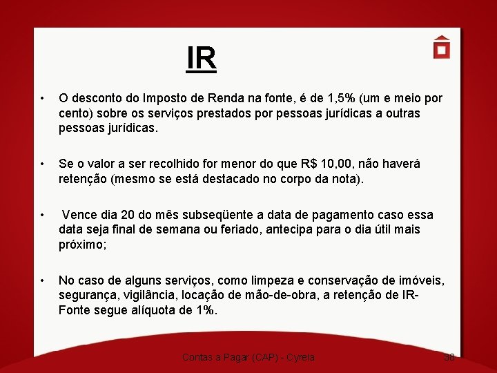 IR • O desconto do Imposto de Renda na fonte, é de 1, 5% (um e meio por cento) sobre os serviços prestados por pessoas jurídicas a outras pessoas jurídicas. • Se o valor a ser recolhido for menor do que R$ 10, 00, não haverá retenção (mesmo se está destacado no corpo da nota). • Vence dia 20 do mês subseqüente a data de pagamento caso essa data seja final de semana ou feriado, antecipa para o dia útil mais próximo; • No caso de alguns serviços, como limpeza e conservação de imóveis, segurança, vigilância, locação de mão-de-obra, a retenção de IRFonte segue alíquota de 1%. Contas a Pagar (CAP) - Cyrela 38