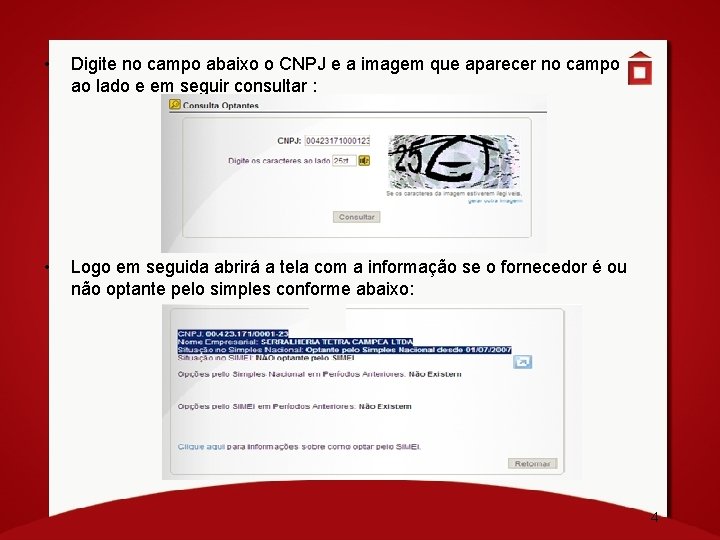 • Digite no campo abaixo o CNPJ e a imagem que aparecer no campo ao lado e em seguir consultar : • Logo em seguida abrirá a tela com a informação se o fornecedor é ou não optante pelo simples conforme abaixo: 4