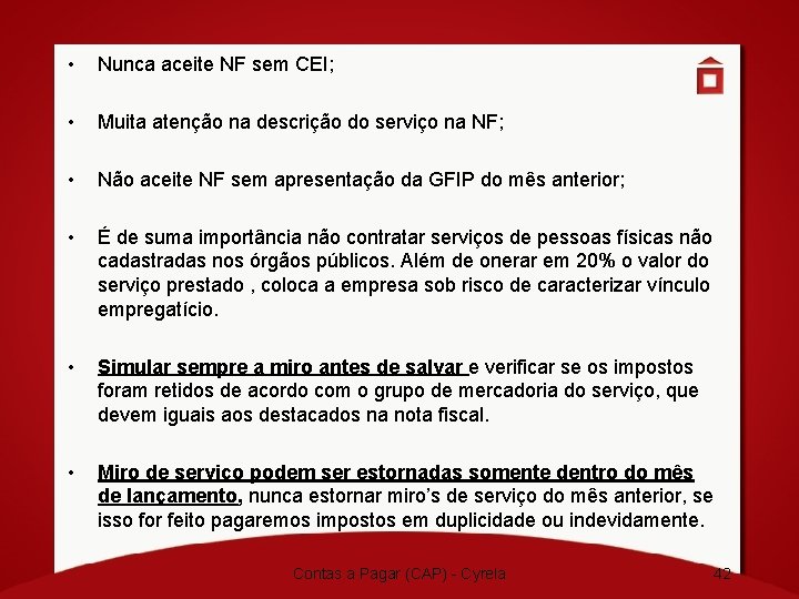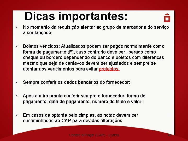 Dicas importantes: • No momento da requisição atentar ao grupo de mercadoria do serviço a ser lançado; • Boletos vencidos: Atualizados podem ser pagos normalmente como forma de pagamento (F), caso contrario deve ser liberado como cheque ou borderô dependendo do banco e boletos com diferenças mesmo que seja de centavos devem ser ajustados e sempre se atentar aos vencimentos para evitar protestos; • Sempre conferir os dados bancários do fornecedor; • Após a miro pronta conferir sempre o fornecedor, forma de pagamento, data de pagamento, número do titulo e valor; • Em casos de optante pelo simples, as notas devem ser encaminhadas ao CAP para devidas alterações Contas a Pagar (CAP) - Cyrela 41