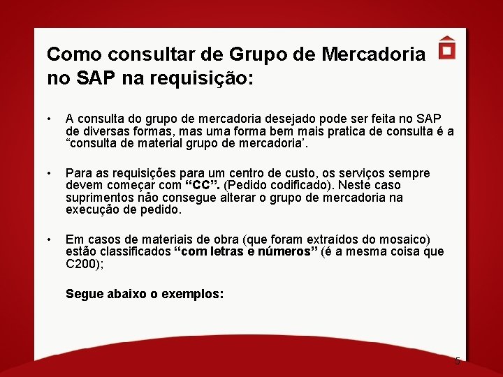 Como consultar de Grupo de Mercadoria no SAP na requisição: • A consulta do grupo de mercadoria desejado pode ser feita no SAP de diversas formas, mas uma forma bem mais pratica de consulta é a “consulta de material grupo de mercadoria’. • Para as requisições para um centro de custo, os serviços sempre devem começar com “CC”. (Pedido codificado). Neste caso suprimentos não consegue alterar o grupo de mercadoria na execução de pedido. • Em casos de materiais de obra (que foram extraídos do mosaico) estão classificados “com letras e números” (é a mesma coisa que C 200); Segue abaixo o exemplos: 5